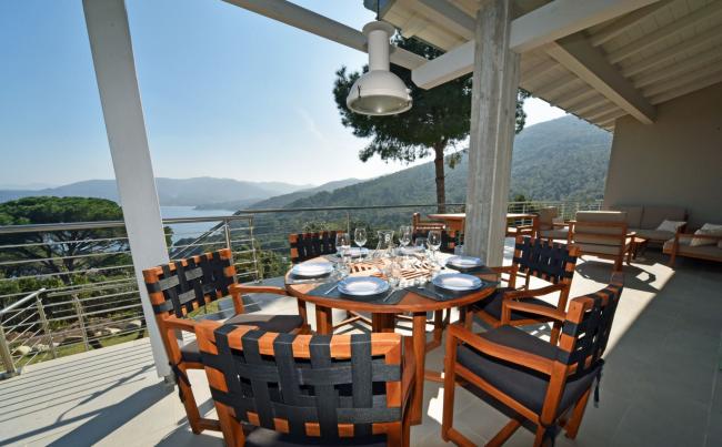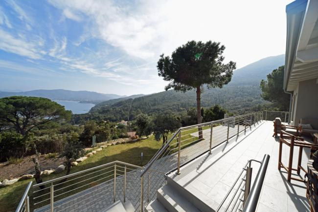 Brandneue, freistehende Villa mit Blick auf den Golf, mit privatem eingezäuntem Garten und umgeben von 20.000 m² Waldfläche. Zwei Schlafzimmer (für maximal 5 Gäste). Große Panoramaterrasse mit Loungebereich und Esstisch im Freien mit Meerblick. Zwei Badezimmer mit Dusche, Klimaanlage, Grill, Außenspüle und Auß... Mehr sehen